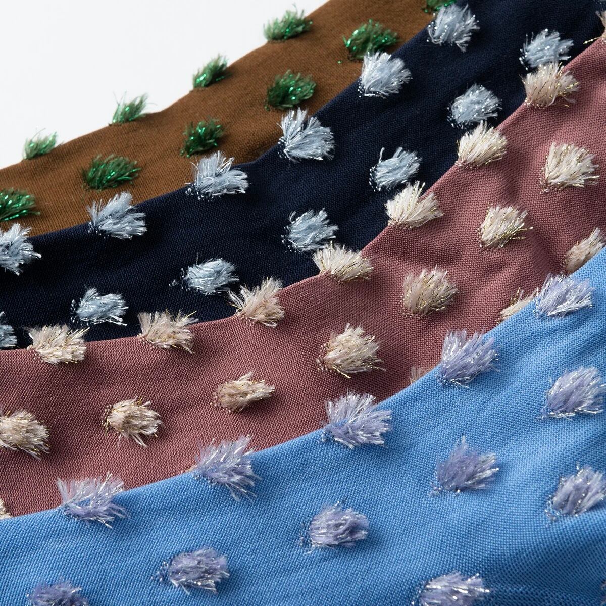 本体にファーのように毛足を長くしたものをドット状に散りばめられたデザインのソックス。ラメ糸も入っているのでシンプルながらも女性らしく上品なソックスです。