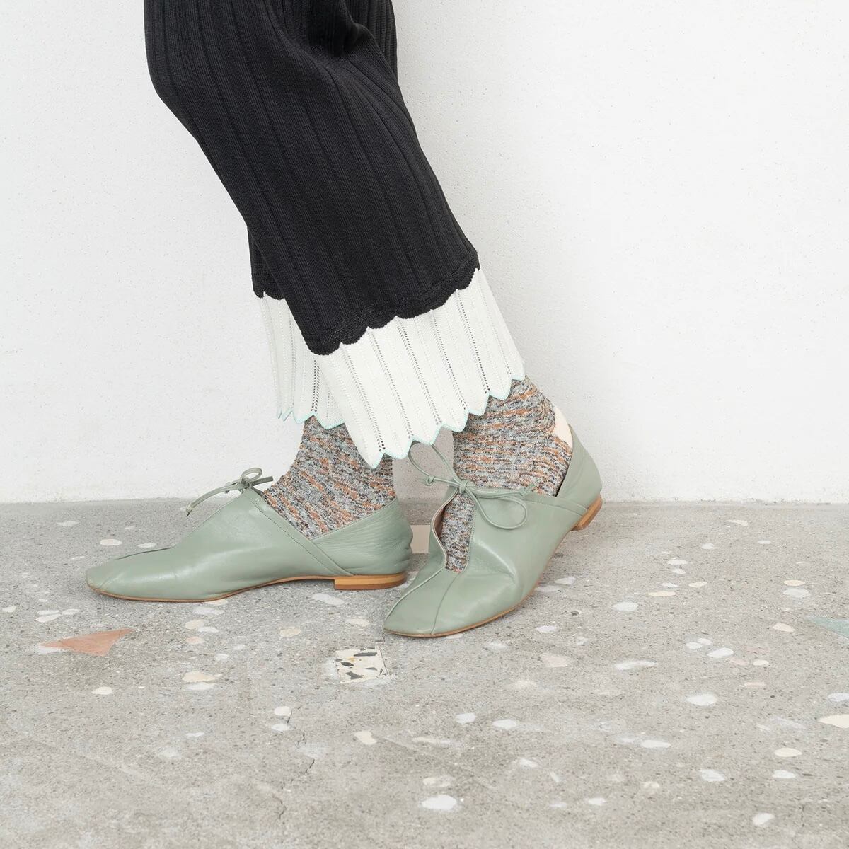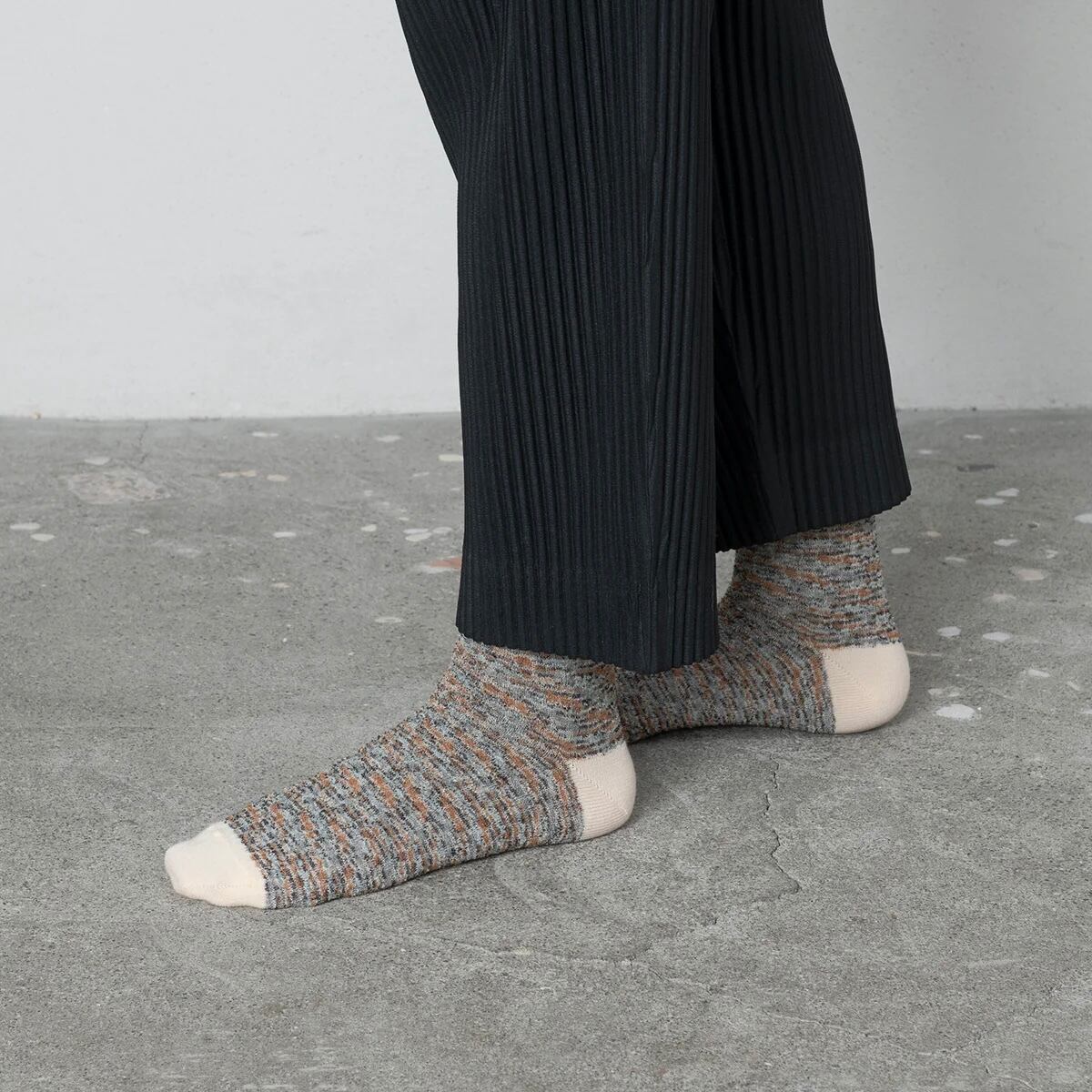 マルチカラーのかすり糸が表情豊かなバンピーソックス。 伸縮性がある凹凸組織は足が小さめな方が履くと立体的な柄に浮き上がり、足が大きめの方が履くとフラットな柄に変化。