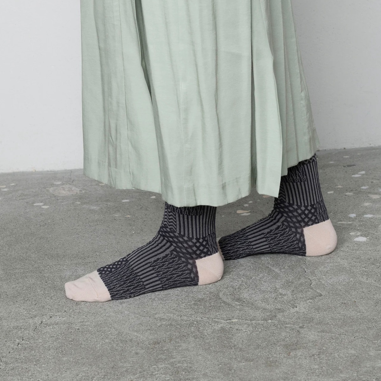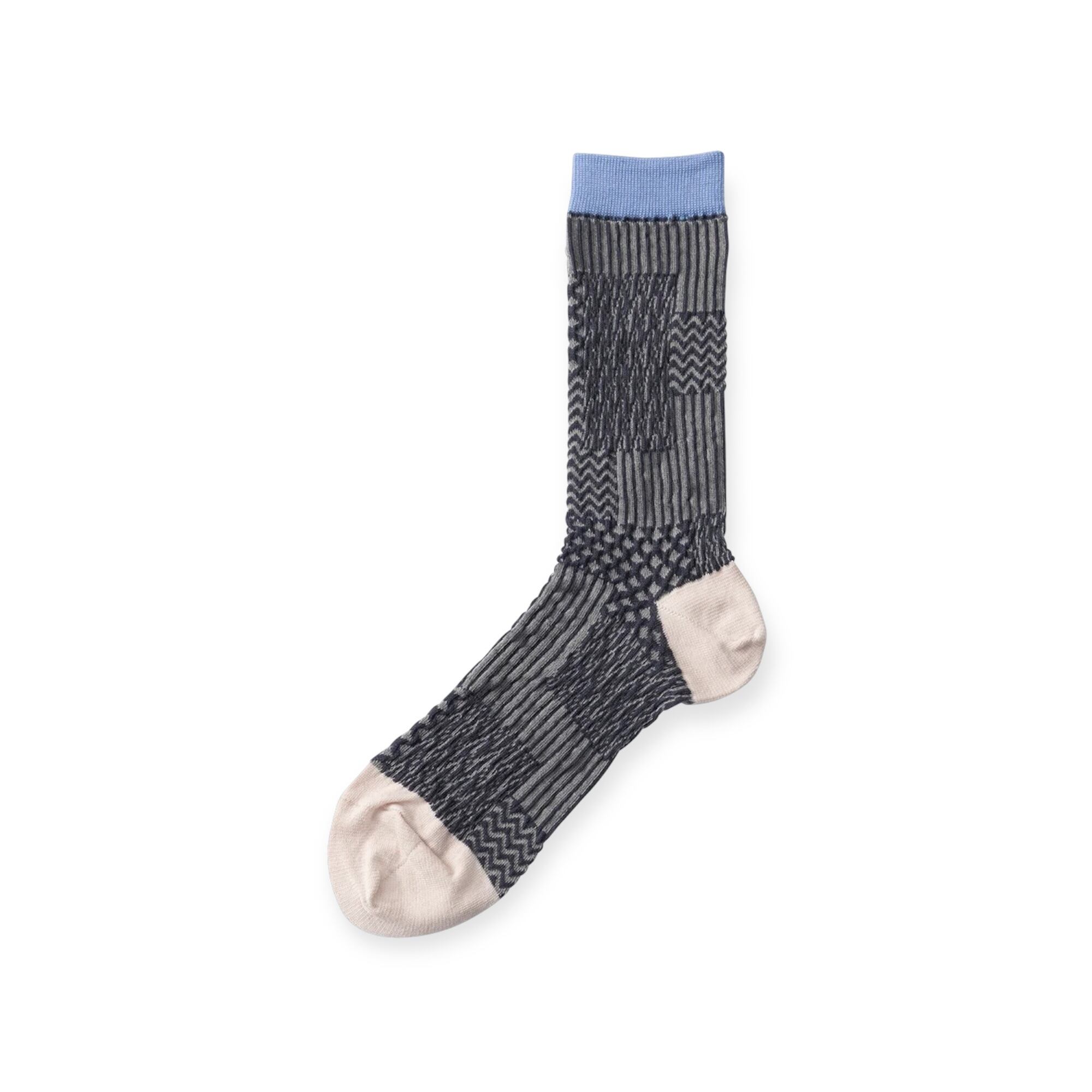 パッチワーク柄がユニークな凹凸ソックス。 多種類の柄を貼り合わせたデザインが、ワントーンでも存在感のある印象に。 伸縮性がある凹凸組織は足が小さめな方が履くと立体的な柄に浮き上がり、足が大きめの方が履くとフラットな柄に変化します。