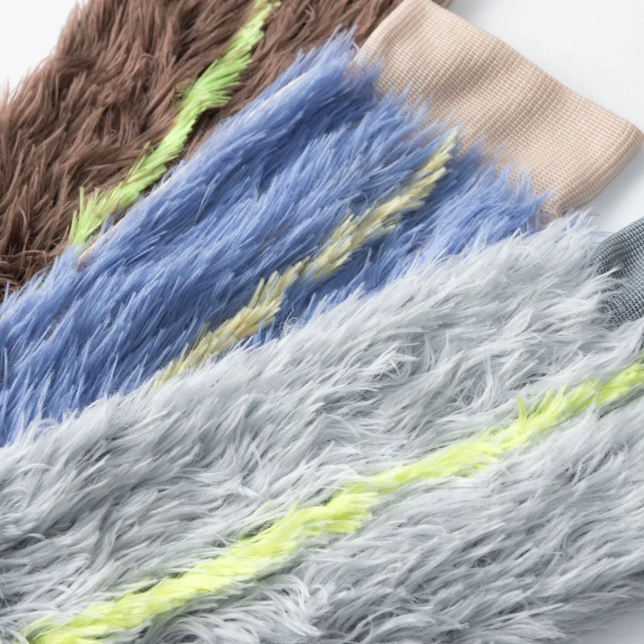 ファーのように毛足が長い素材を使ったクルー丈ソックス。サイドにラインが入っているのでシンプルですが少しエッジの効いたデザイン。ファー素材が秋冬感が増し、あえて足元を見せたくなるデザインです。