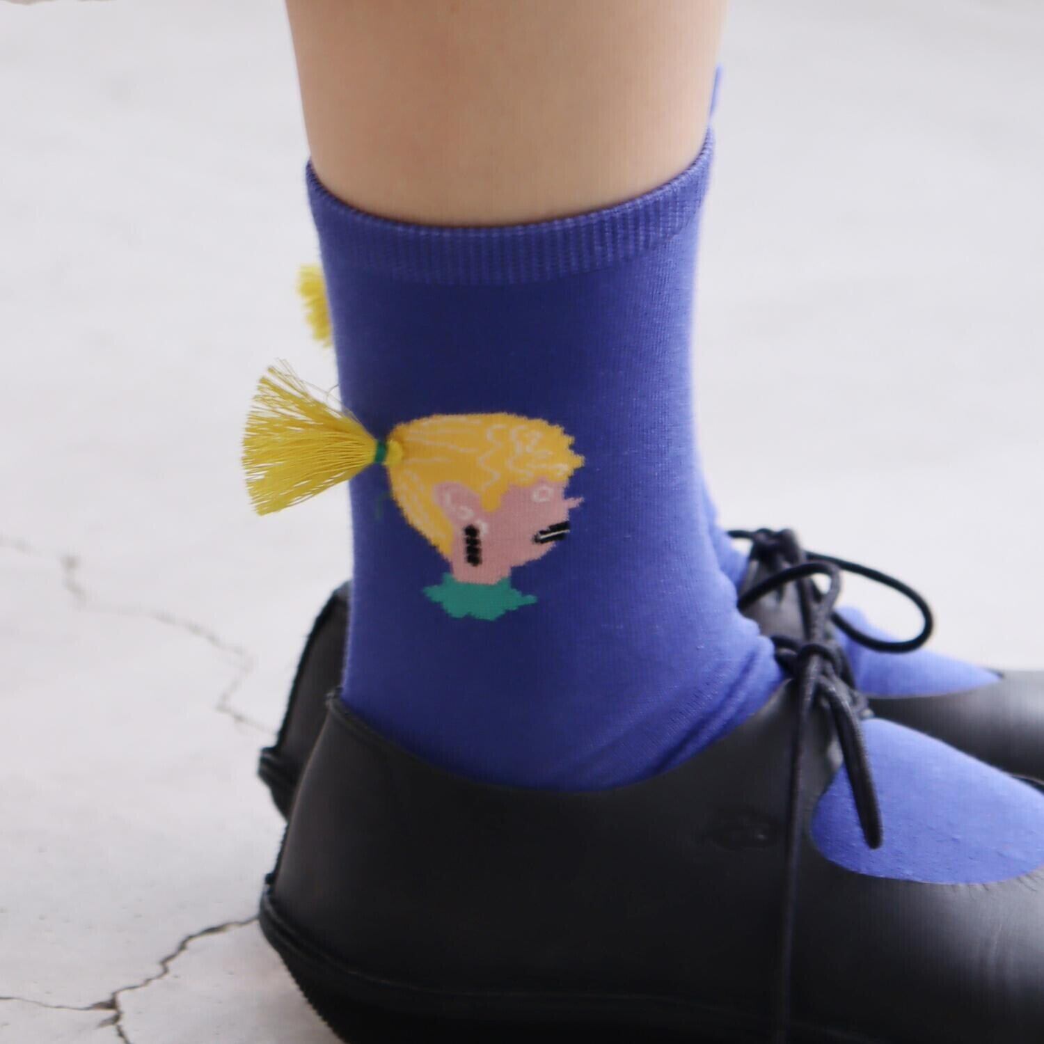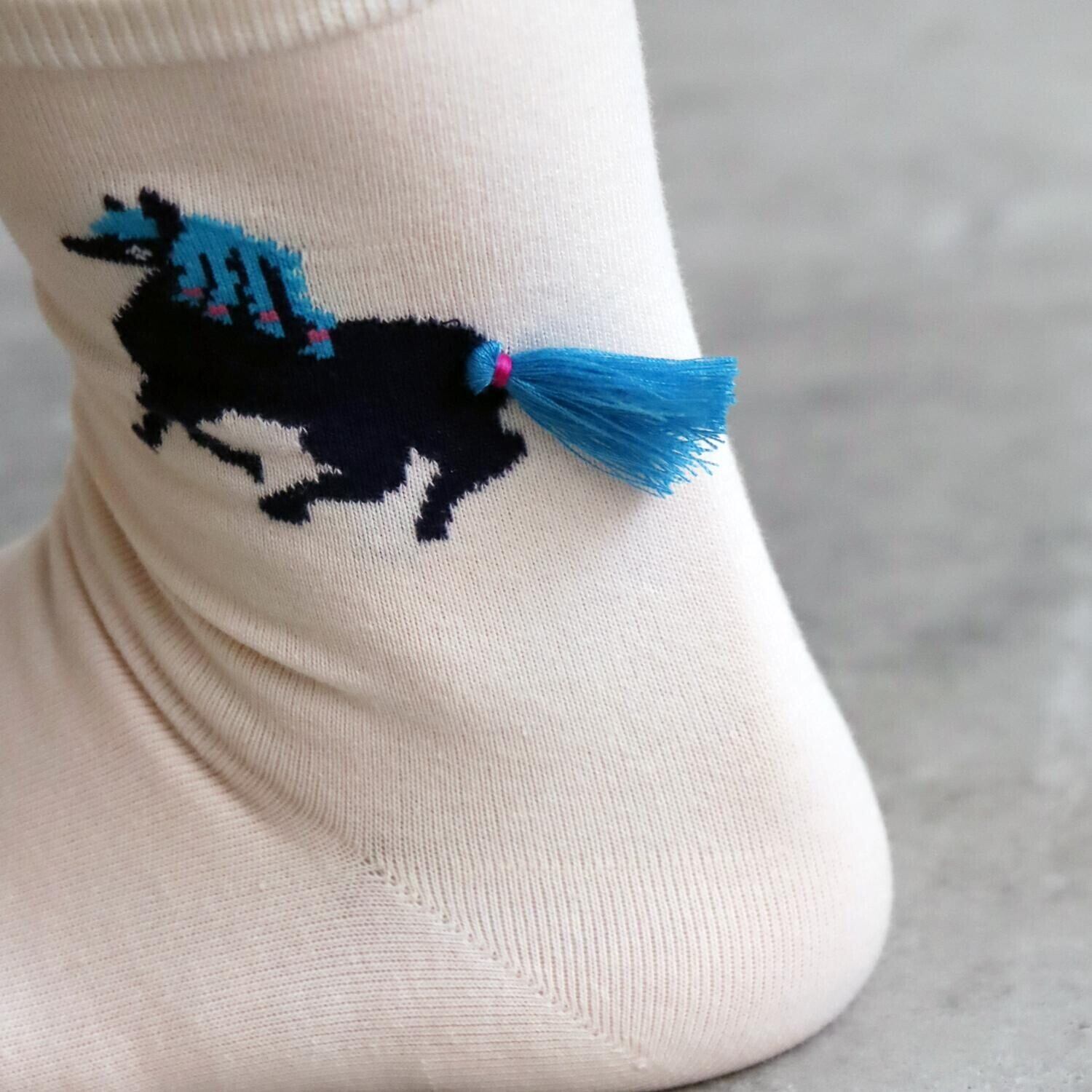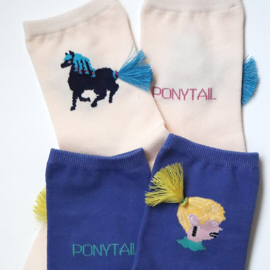 女の子の髪型のポニーテールと、馬のしっぽのポニーテール、タッセルになって足もとでゆらり。遊び心あふれるソックスできました。