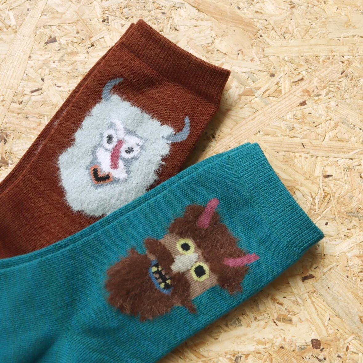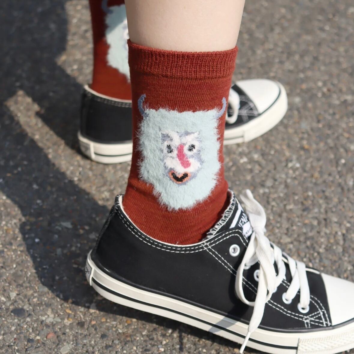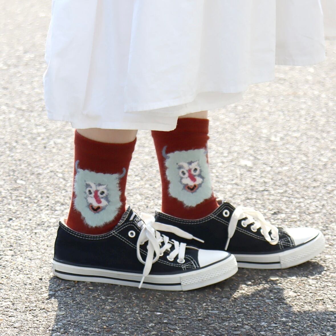 ルー周辺の祭礼用仮面からマニアインスピレーションを得た「ふさふさ仮面」モチーフのソックス。遊び心のあるデザインが、日常のスタイルにフォークロアのエッセンスを添えてくれます。