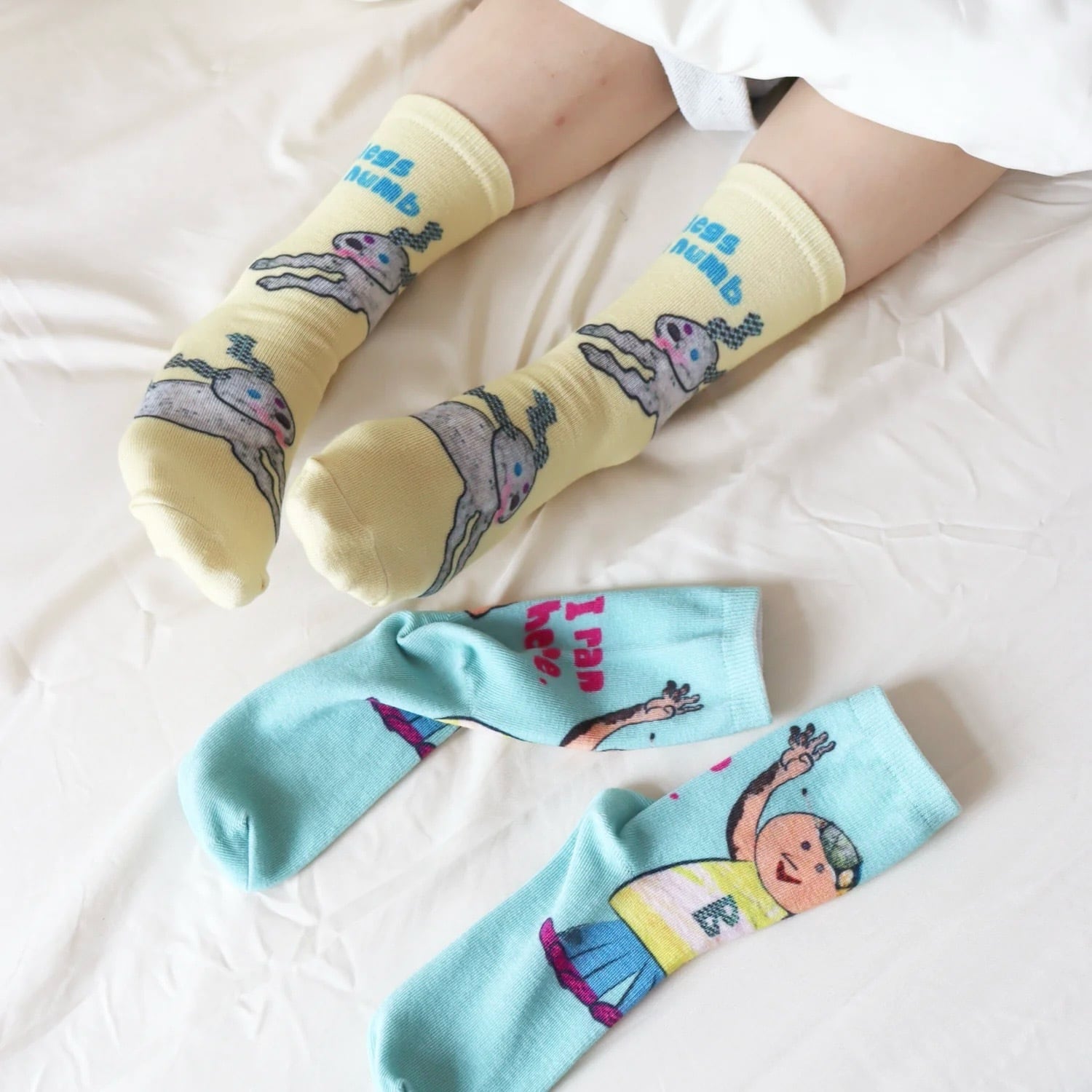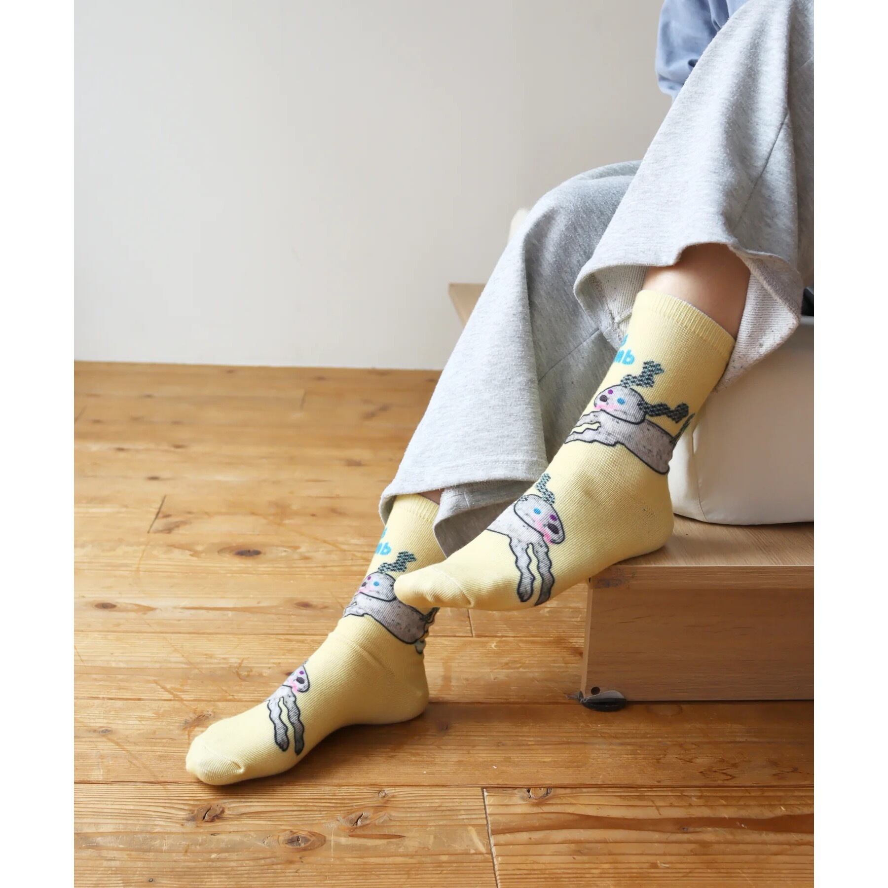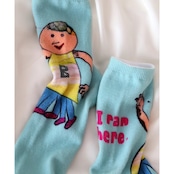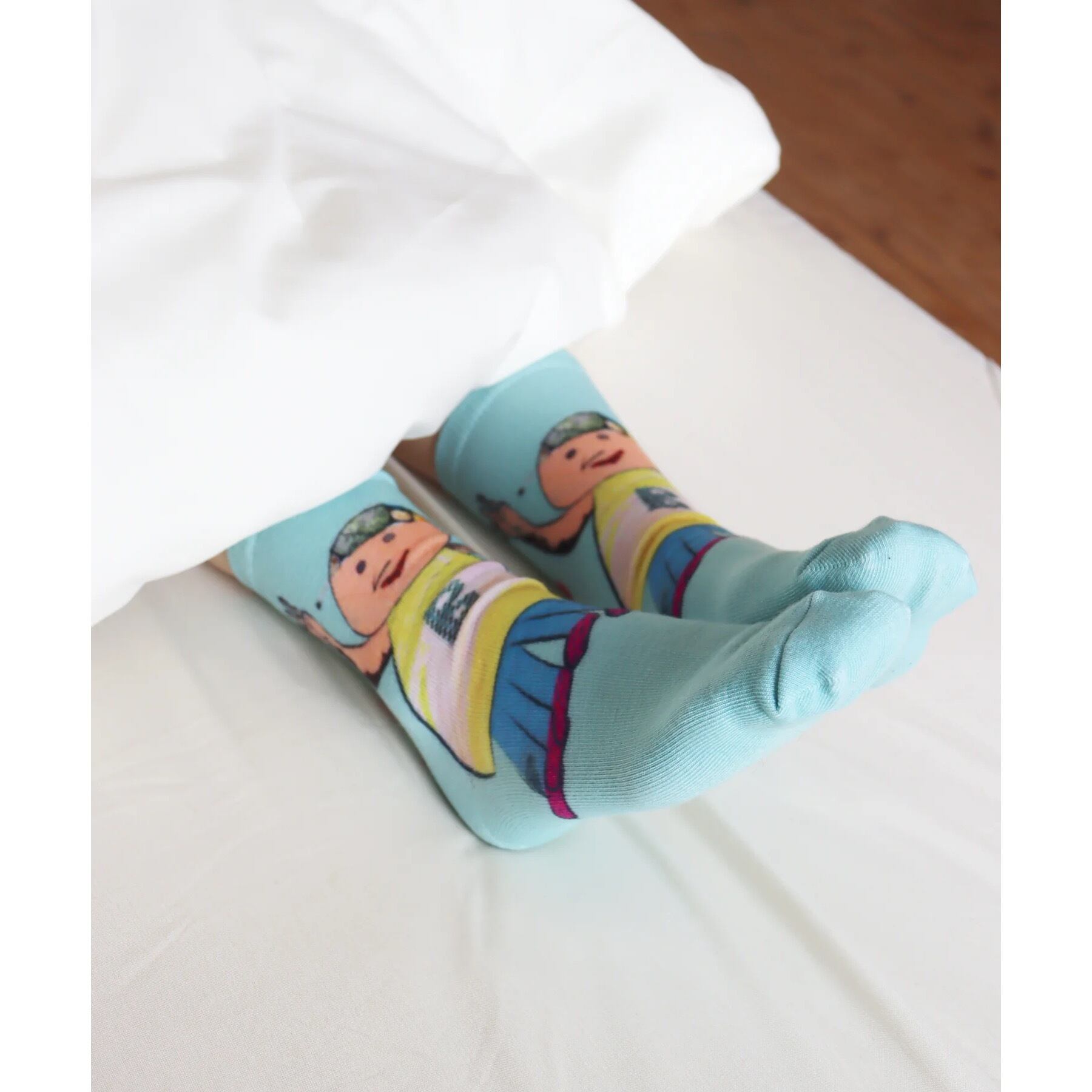 コラージュタッチのイラストを大胆にプリントした、遊び心たっぷりのソックス。