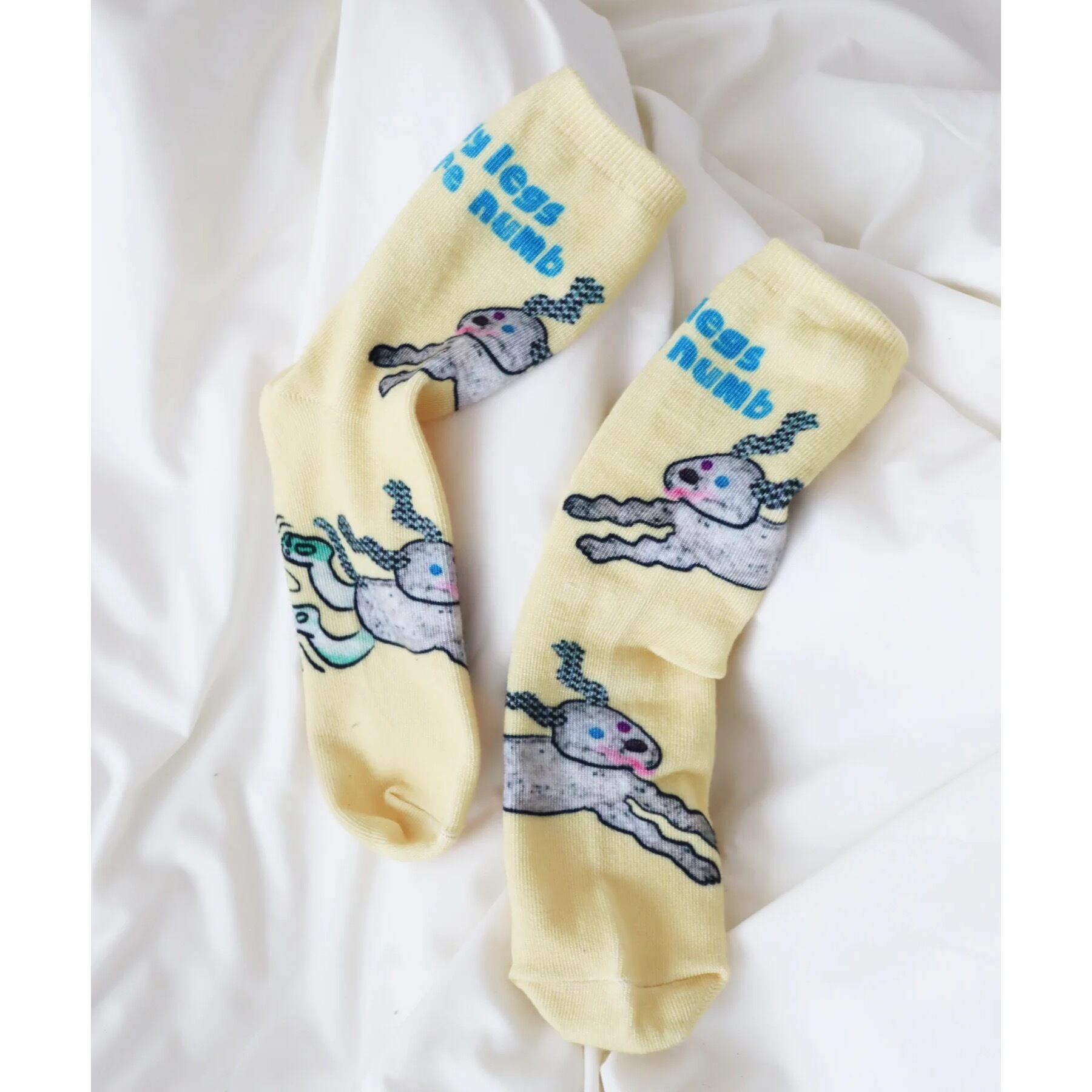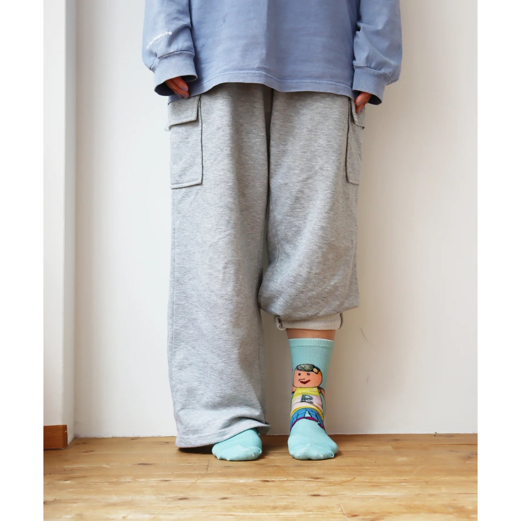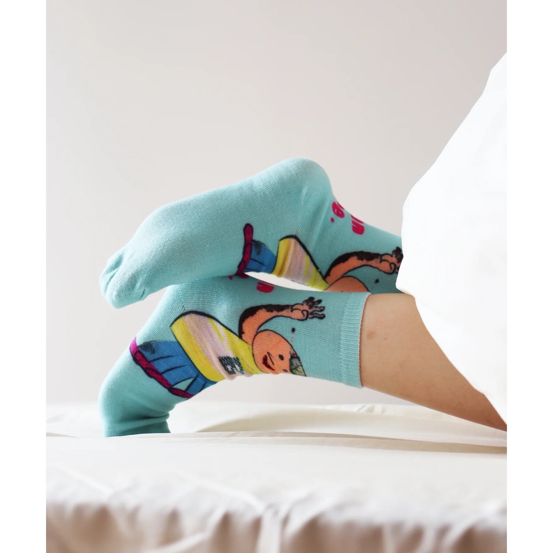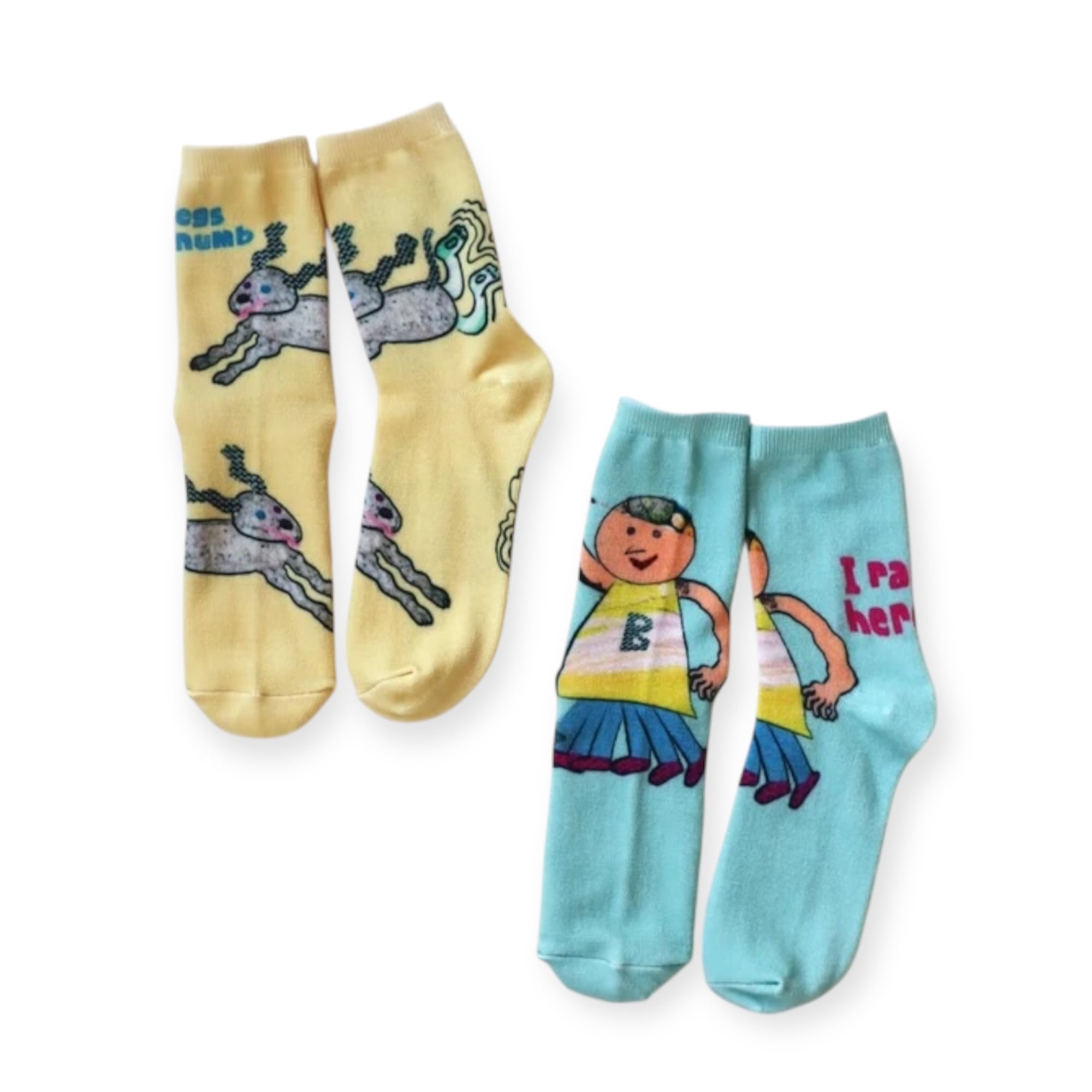 コラージュタッチのイラストを大胆にプリントした、遊び心たっぷりのソックス。