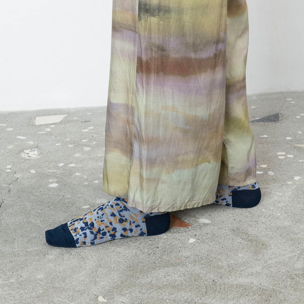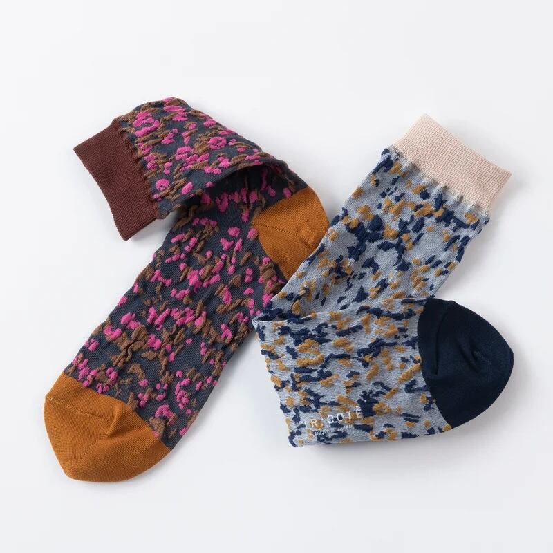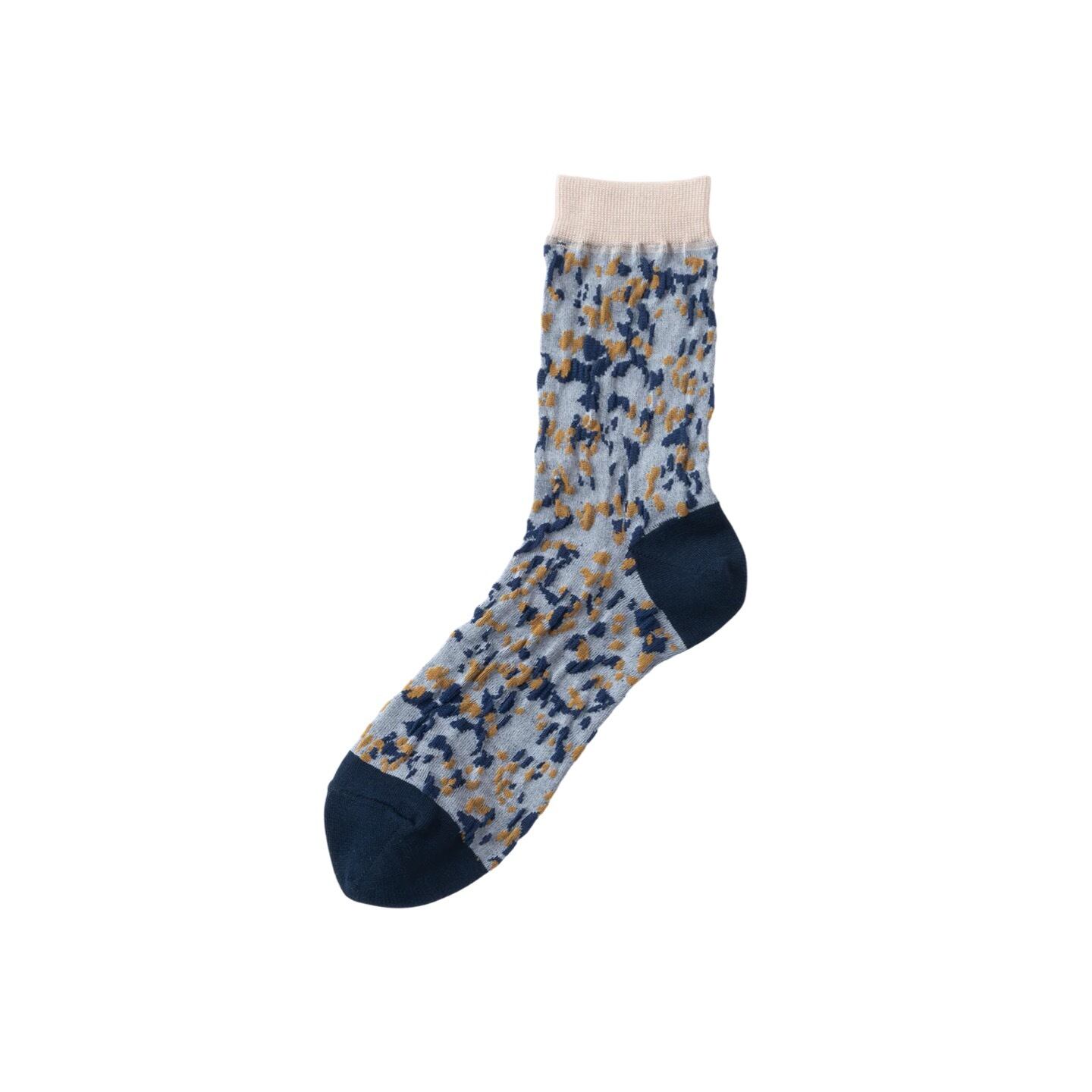 ペンキを散らしたようなまだら模様が特徴的な凹凸ソックス。 伸縮性があり、23-26cmと幅広い方に履いていただけ印象も変わります。 さらりとした綿素材なので一年通して履けるのも嬉しいポイント。 スニーカーやローファーなど靴の履き口からちらりと見せたくなる靴下です。