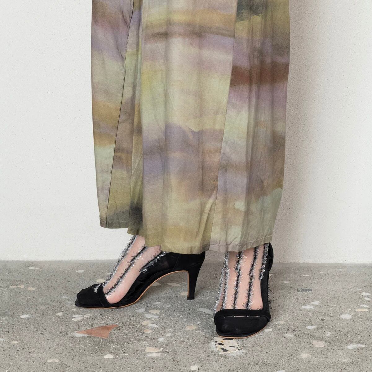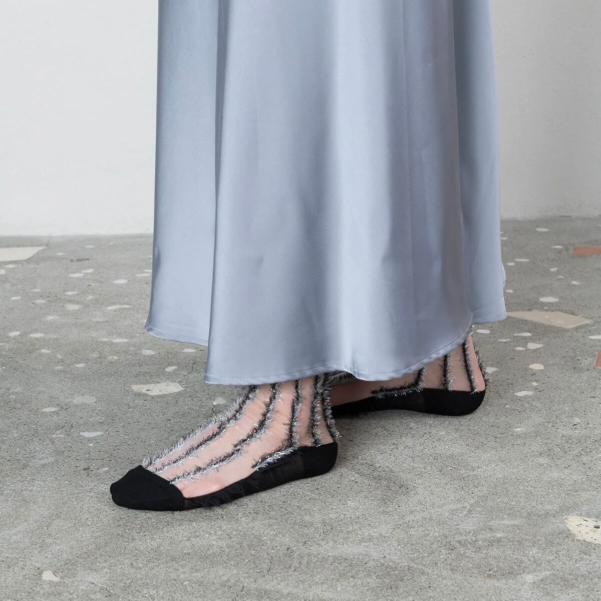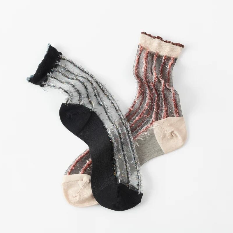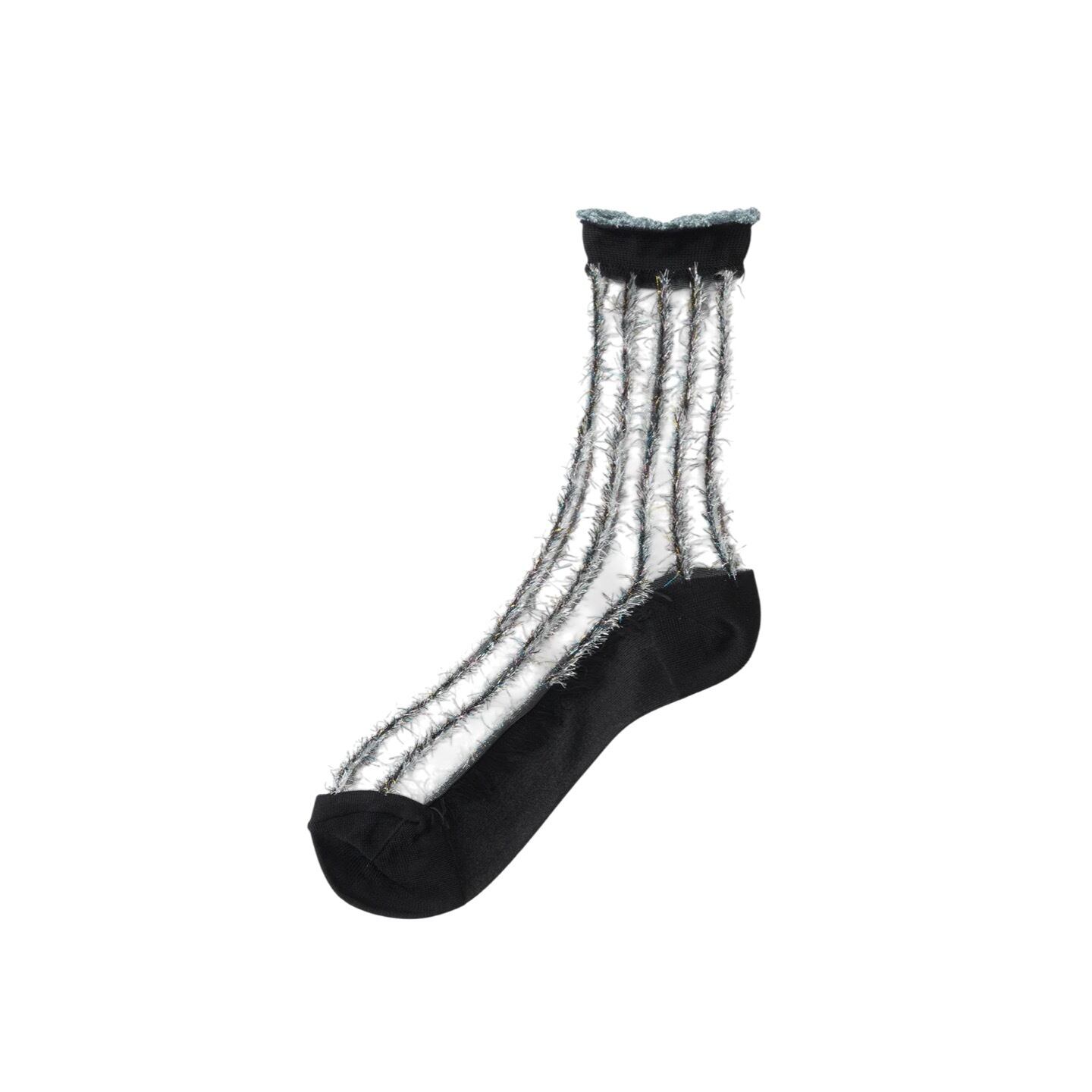 ラメ糸のフリンジストライプが目を惹くデザイン靴下。 透け感のある素材が肌に馴染み、奇抜なデザインでも控えめな印象に。 サンダルやミュールに合わせて夏らしくコーディネートするのがおすすめです。