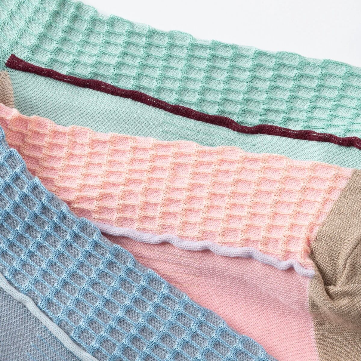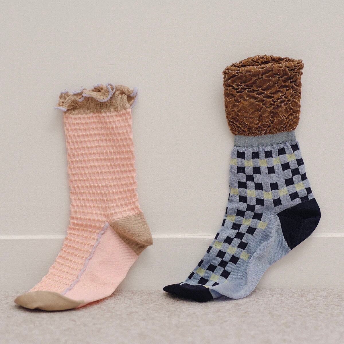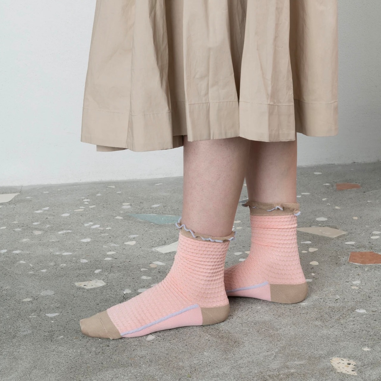 アイスクリームのような配色と履き口のフリルが可愛いバンピーソックス。 凹凸組織に伸縮性があり、23-26cmと幅広い方に履いていただけ、印象も変わります。 さらりとした綿素材なので一年通して履けるのも嬉しいポイント。 スニーカーやローファーなど靴の履き口からちらりと見せたくなる靴下です。