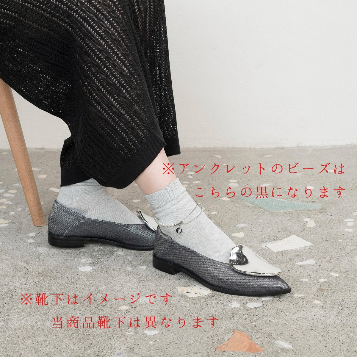 アンクレット付きのカラーソックス。さらりとしたベーシックな靴下にパールと天然石のアクセントがきらりと光ります。取り外しできるアンクレットは腕につけてブレスレットとしても使用可能。靴やお出かけのスタイルに合わせておしゃれを楽しんでいただけるアイテムです。